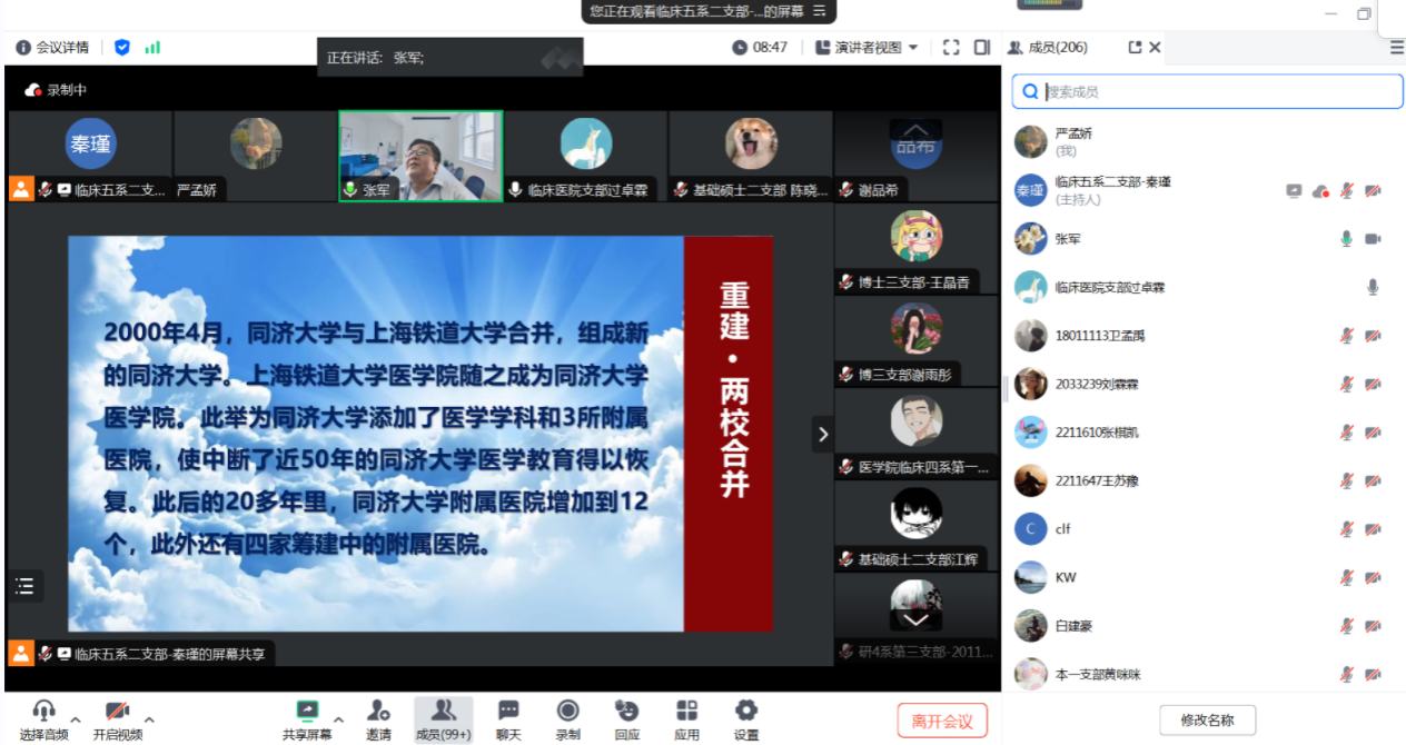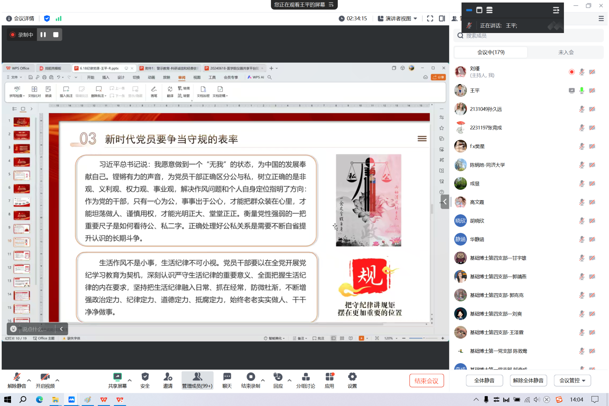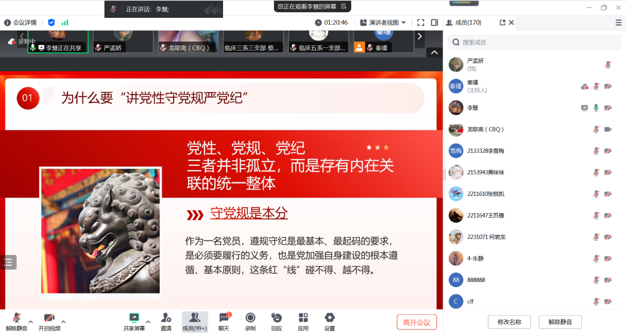 医管处处长张军的党课主题为《学党纪,促进伟德国际victor1946附属医院学科发展》。张军从《条例》五次修订情况、2023年修订的五个亮点、高校违纪警示案例、医疗领域反腐及学科发展四个方面进行了分享。计有200余名师生党员参与本次党课学习。