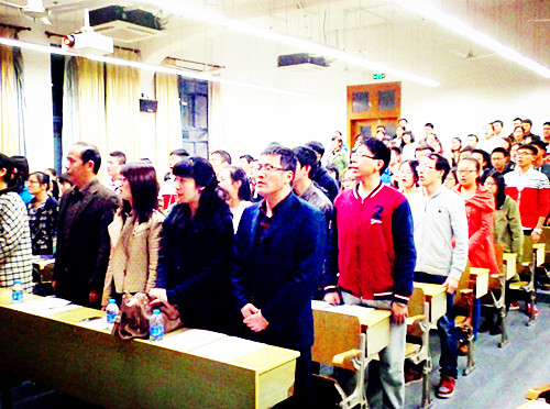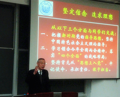 接着,校关工委报告团欧阳杰老师为党校同学上了第一课:“坚定信念、追求理想——与争取入党同学交流党的理论基础”,分别从三个方面:把握新时期党的指导思想,坚持中国特色社会主义理论指导;学习领会今年全国两会精神,落实“四个全面”的战略布局;坚持首先从“思想上入党”,牢记使命,承担责任,敢于担当。从历史到现实的正反两方面的经验与教训,以详实的数据和生动的事例,并结合自己入党50年的亲身经历与体会,图文并茂,理论联系实际与同学们进行交流。