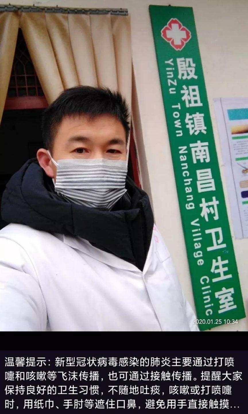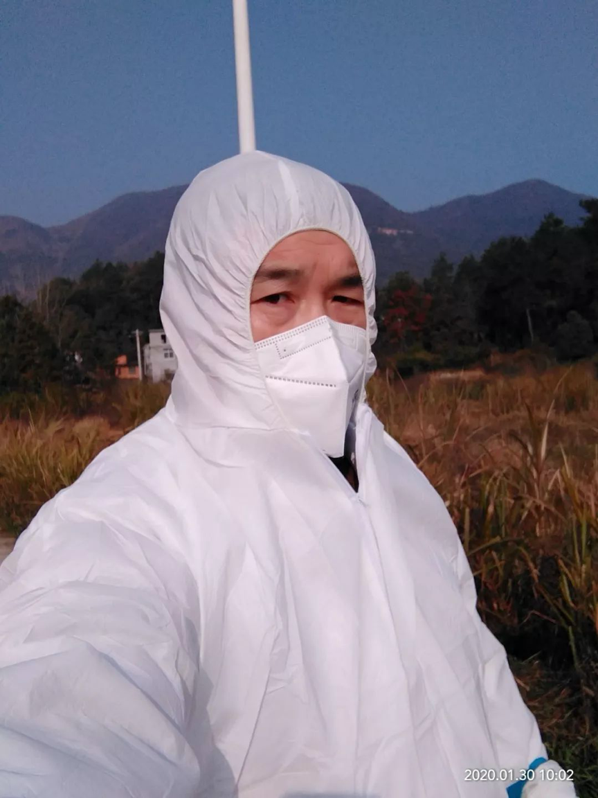 照片里穿着防护服的医生叫余长春,是湖北省黄石市(大冶市)殷祖镇南昌村卫生室的一名乡村医生。2020年1月25日,在鼠年的第一天,他就已经坚守在自己的岗位,为抗击新型冠状病毒肺炎贡献自己的力量。他的主要工作是统计从武汉回村的人员信息,并对相关村民进行简单的检查,排查新型冠状病毒肺炎的疑似患者。为了确保采集信息的准确性,他逐一上门为村民测量体温、嘱咐他们居家隔离,向他们分发体温计、口罩和药物,还指导年老的村民使用体温计。为了避免更多的接触和交叉感染,他通过电话给村民提供咨询并在朋友圈进行新型冠状病毒肺炎的知识宣传。
