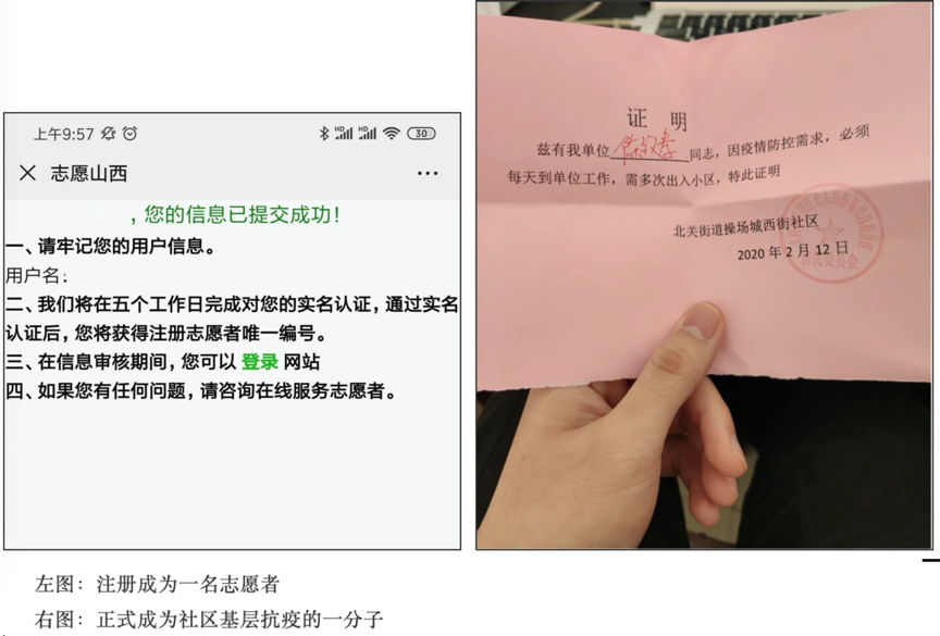 陈致鸯,伟德国际victor19462018级眼科学硕士,身处山西省大同市平城区,春节期间,在本地疫情愈发严重之后,积极参与到社区防疫工作中,主动报名并成为当地社区防疫工作处的一名志愿者。向社区人员宣传疾病预防控制知识,负责社区内隔离病人数据统计及每日电话访问。并在小区门口负责出入人员、车辆登记,体温测量。在这场战“疫“中守护人民的生命健康。
