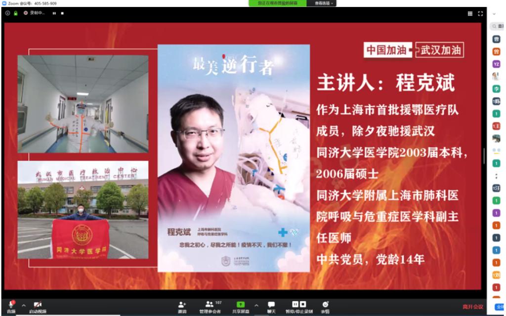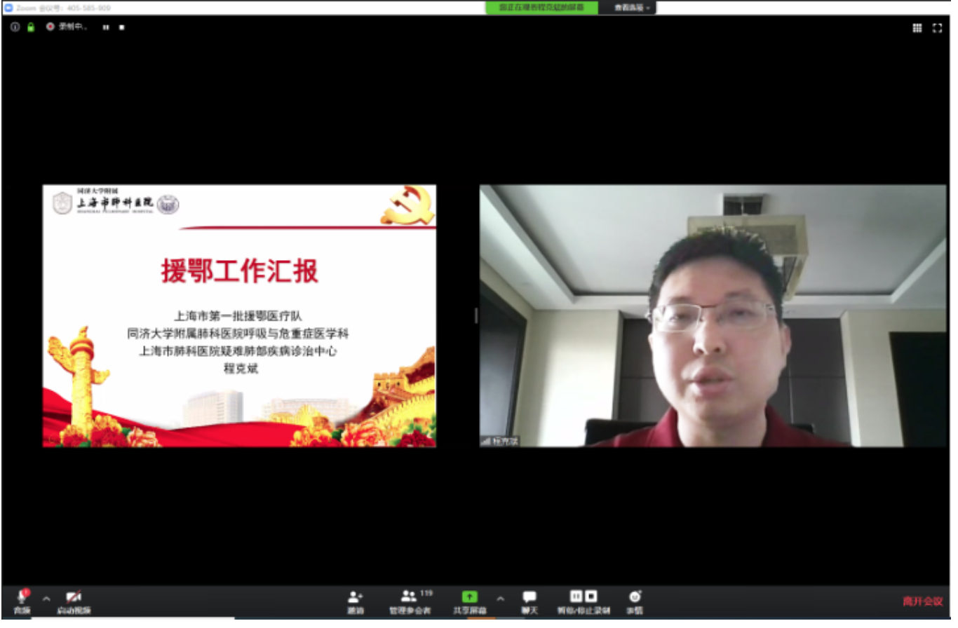 4月9日,伟德国际victor1946员工党支部在线上平台召开了以“生命 责任 家国”为主题的系列线上援鄂事迹报告会,展现公司党员同志们在疫情防控工作中冲锋在前、顽强拼搏的抗疫事迹。此次报告会主讲人程克斌医生是伟德国际victor1946员工、现任伟德国际victor1946附属上海市肺科医院呼吸与危重症医学科副主任医师。他将67天支援武汉金银潭医院的抗疫经历做了详细汇报,并耐心回答了同学们的相关疑问。报告会由公司党委副书记曾盈主持,伟德国际victor1946的员工党员们参与了此次会议。