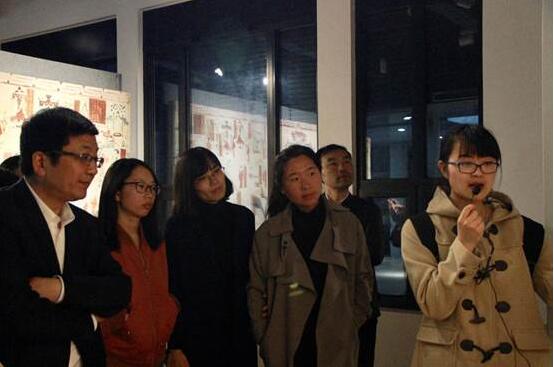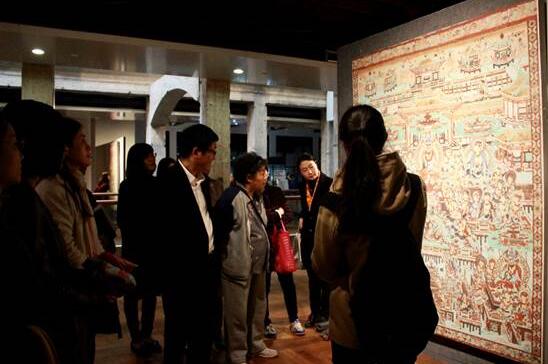 在讲解员的带领下,党员同志们步入位于同济博物馆的敦煌壁画展厅,一幅幅精美的壁画映入眼帘。紧接着,讲解员带领大家开始了此次敦煌之旅——《文殊变》、《普贤变》、《观无量寿经变》、《水月观音》… …一幅幅静态的壁画在讲解员的描述中变得栩栩如生,大家不时情不自禁地赞叹壁画的精妙和中国古代人民的智慧。“我感叹我敬仰,把艺术融进每寸墙壁的巨匠,把灵魂融进艺术的巨匠……”