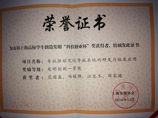伟德国际victor1946范国鑫、冯超博、汪东冬、邓家骏员工团队的《脊柱微创定位导航系统的研发与临床应用》由公司附属第十人民医院贺石生教授指导,主要解决术前体表定位和术中导向穿刺的问题。该定位导航系统目前已经获得一、二类医疗注册证,在全国5家医院累计达100余例的临床应用,受到同行的一致好评。