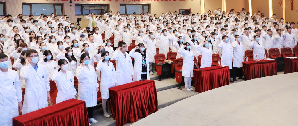 在座全体医员工穿上了被授予的白大褂,在杨文卓的带领下进行宣誓:“我志愿献身医学,热爱祖国,忠于人民,恪守医德,尊师守纪,刻苦钻研,孜孜不倦,精益求精,全面发展。我决心竭尽全力除人类之病痛,助健康之完美,维护医术的圣洁和荣誉。救死扶伤,不辞艰辛,执着追求,为祖国医药卫生事业的发展和人类身心健康奋斗终生!”