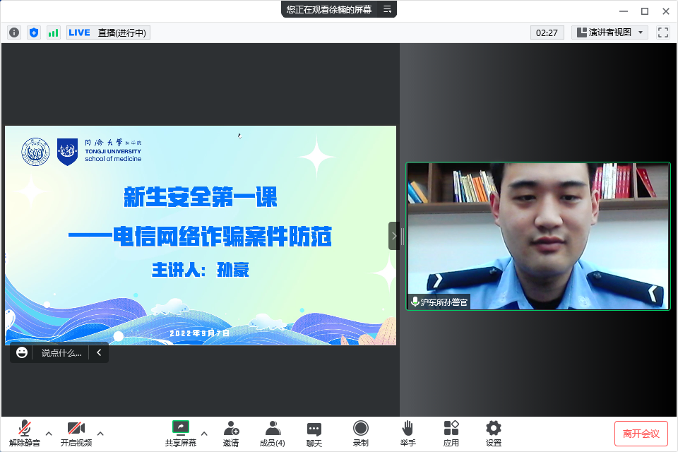 9月7日下午,伟德国际victor1946邀请了上海市公安局文保分局沪东高校派出所的孙豪警官为大家进行入学安全教育讲座。讲座中,孙警官分别从“校园电信网络诈骗案件受害人群”、“网络诈骗案件类型”、“如何预防”出发,结合身边发生的案例对冒充公检法、冒充熟人诈骗、冒充客服诈骗、网络刷单诈骗、网游交易诈骗、代写论文、视频裸聊诈骗等一些典型的诈骗术进行了解析,指出网络上很多不健康行为会给同学们带来错误的引导,也可能会使同学们在无意识情况下造成财产损失。孙警官提醒同学们要保护好个人信息,不要将信息透露给陌生人,不贪小便宜,对于网络电信诈骗信息要不轻信、不透露、不汇款、不转账,时刻绷紧防范之弦,远离诈骗之害!