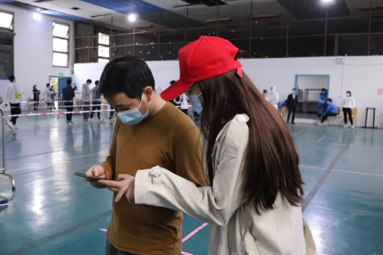 在核酸检测点,他们维持秩序,提醒保持一米线距离,还帮助师生员工登记预约。