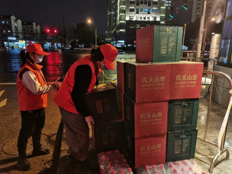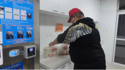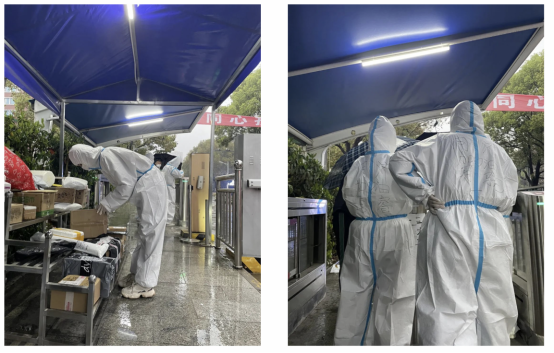 在临时隔离点,按时按点为隔离的同学们送去餐食。