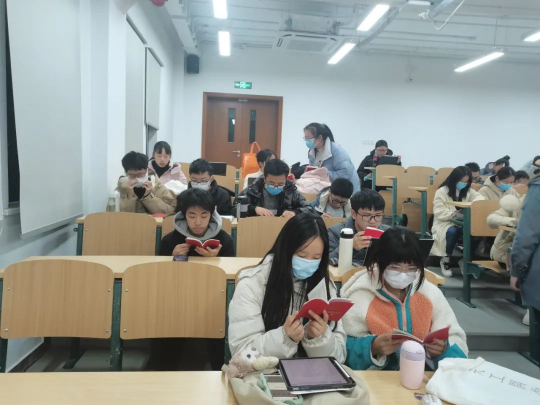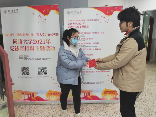 志愿者向同学们发放便携版《中华人民共和国宪法》手册,大家拿到后立即认真阅读起来。