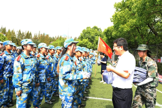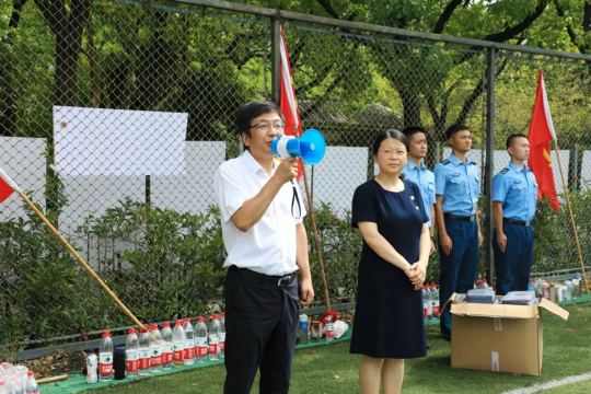 8月30日上午九点半,校领导走进训练方阵,与教官、随训教师和同学们亲切握手、交谈并发放慰问品。陈杰董事长发表重要讲话,强调了在疫情防控中开展军训的机会来之不易,紧接着提出军训意义有三:一是向解放军教官们学习他们的忠诚;二是学习他们的舍生取义精神;三是学习他们的有纪律听指挥。